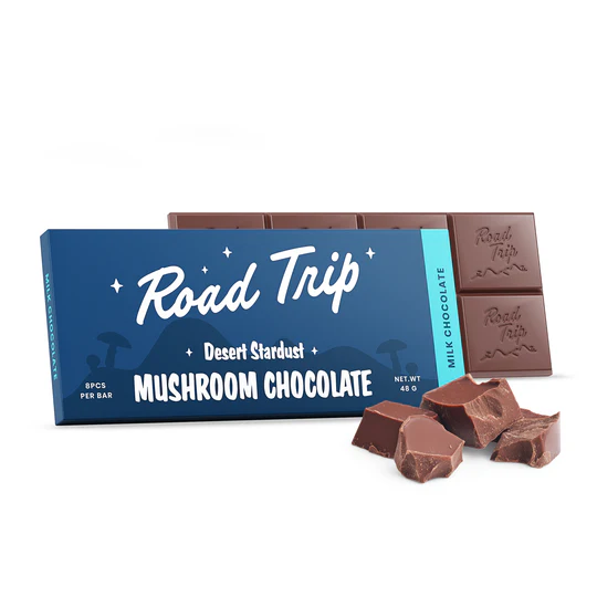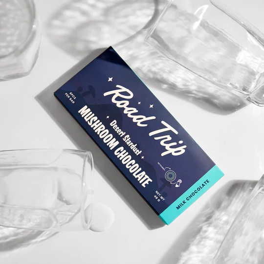 For a festive twist, enjoy the Road Trip Peppermint Bark Mushroom Chocolate Bar, blending white chocolate, peppermint, and candy cane for seasonal bliss infused with the same Desert Stardust magic.