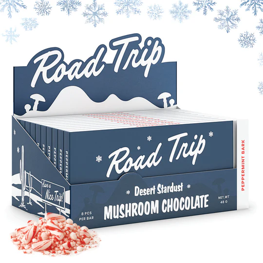 Celebrate the holiday season with the irresistible taste of Road Trip Peppermint Bark Mushroom Chocolate Bar, now for sale online and ready to ship nationwide! Crafted for those who crave both indulgence and balance, this festive treat combines creamy white chocolate with refreshing peppermint swirls and crushed candy cane pieces for a nostalgic winter delight. Each bar is infused with Road Trip’s exclusive Desert Stardust mushroom extract, creating a one-of-a-kind experience that’s equal parts uplifting, smooth, and satisfying.
